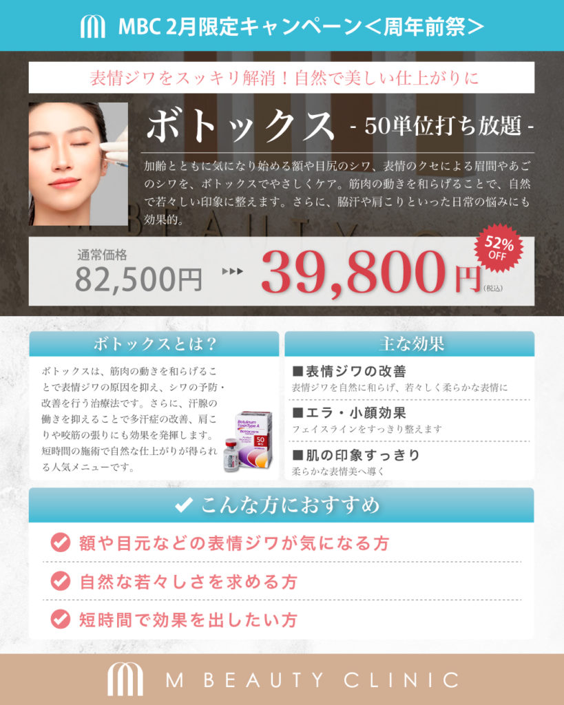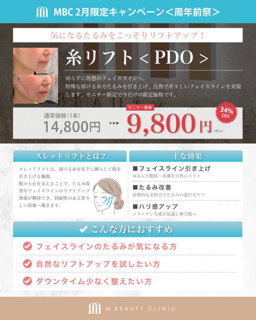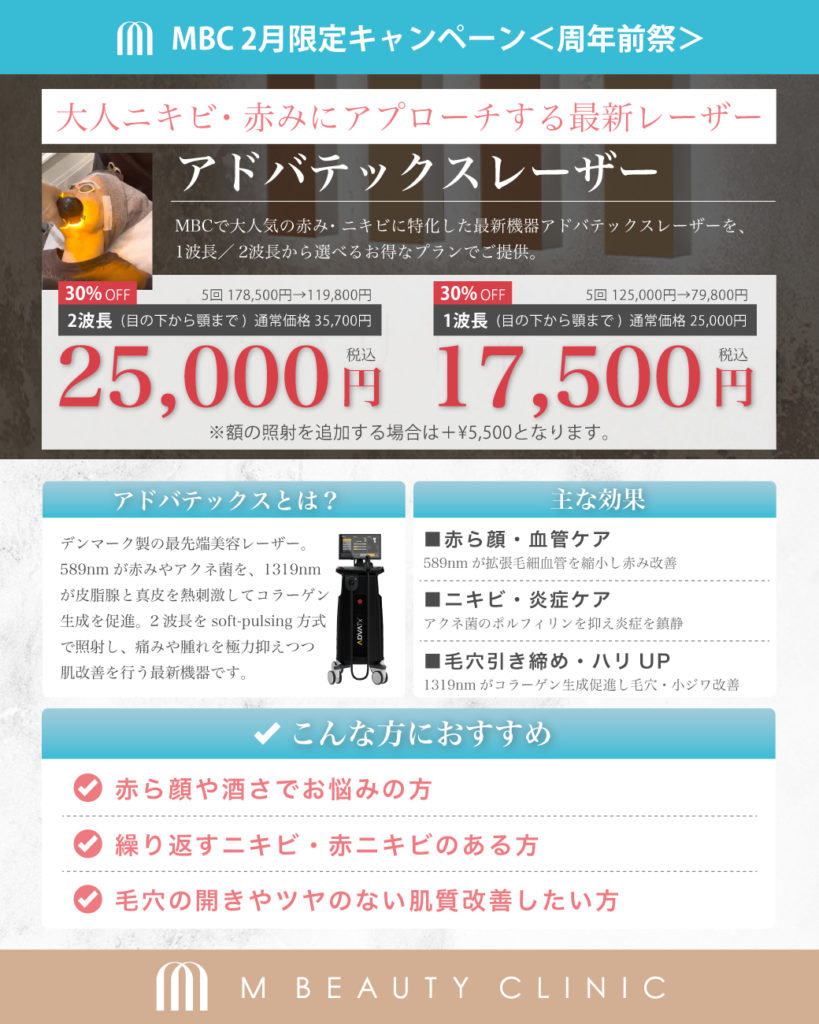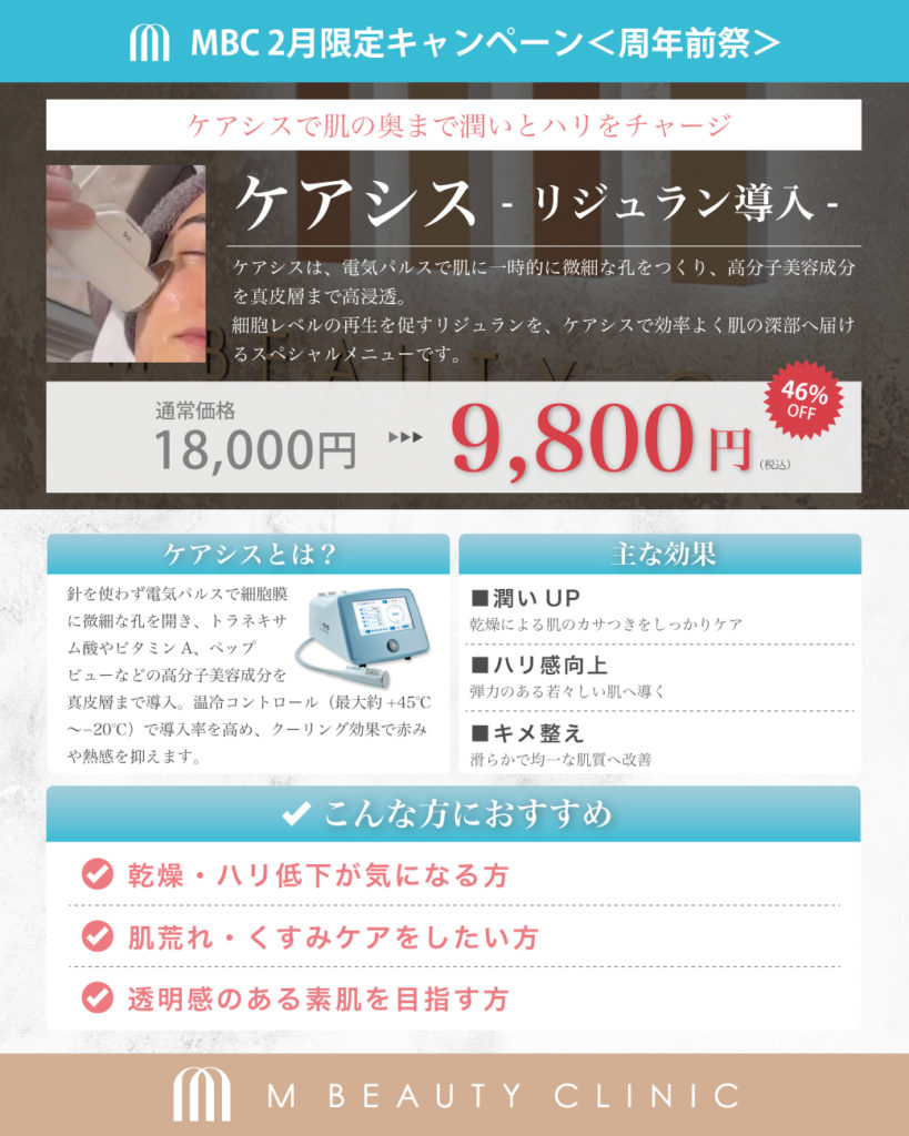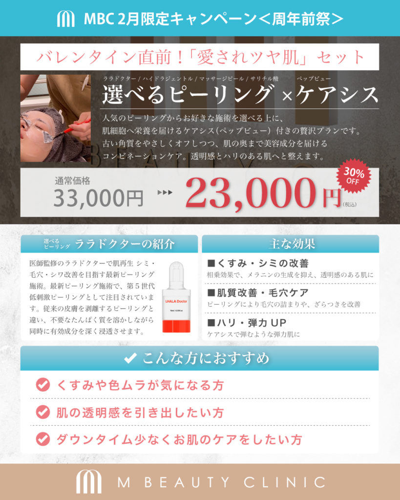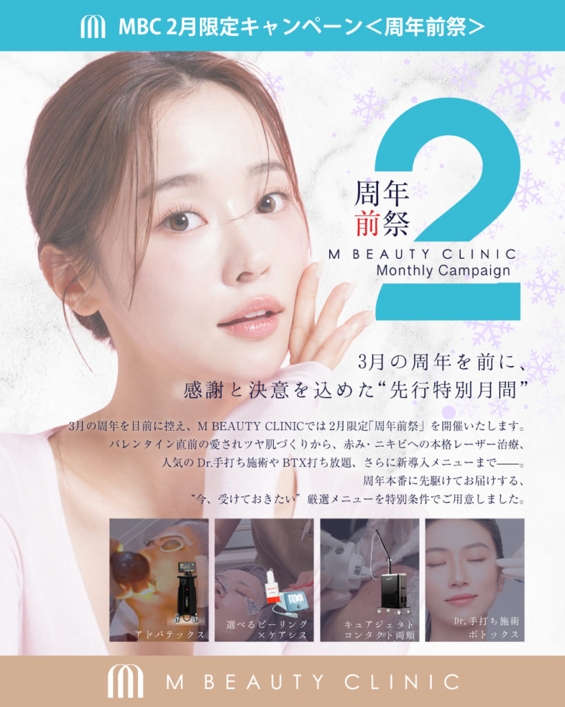 3月の周年を目前に控え、日頃のご愛顧への感謝と、これからのさらなる進化を込めてM BEAUTY CLINICでは<2月限定「周年前祭」>を開催いたします。