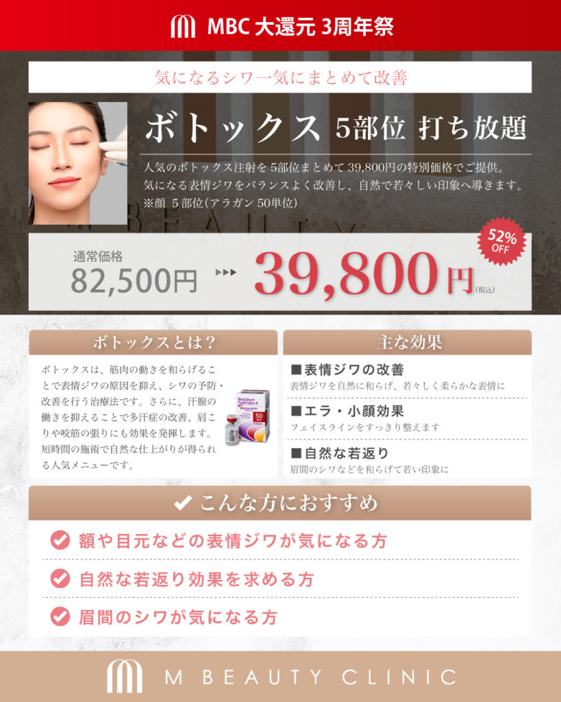 おかげさまでM BEAUTY CLINICは3周年を迎えました。日頃の感謝を込めて、3月は地域最安値に挑戦。不況を吹き飛ばす特別価格で、人気施術を安心・高品質でご提供いたします。